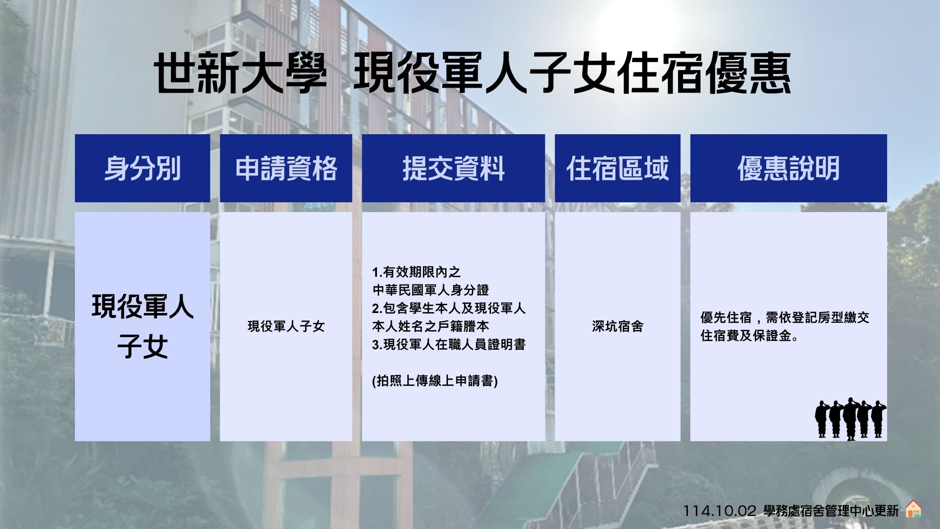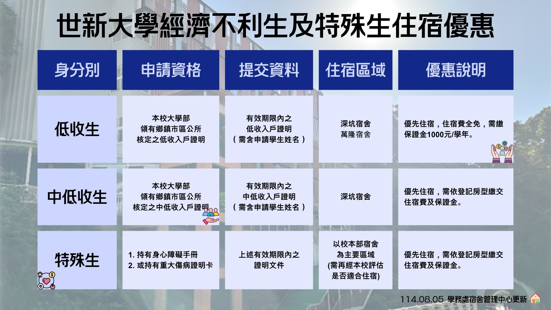 ※114學年度經濟不利生安排之住宿區域為深坑宿舍。如需其他選擇,必須使用一般生身分參與抽籤。